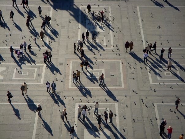Bird’s eye view of people in the Piazza del Duomo in Milan, taken from the roof of the Duomo