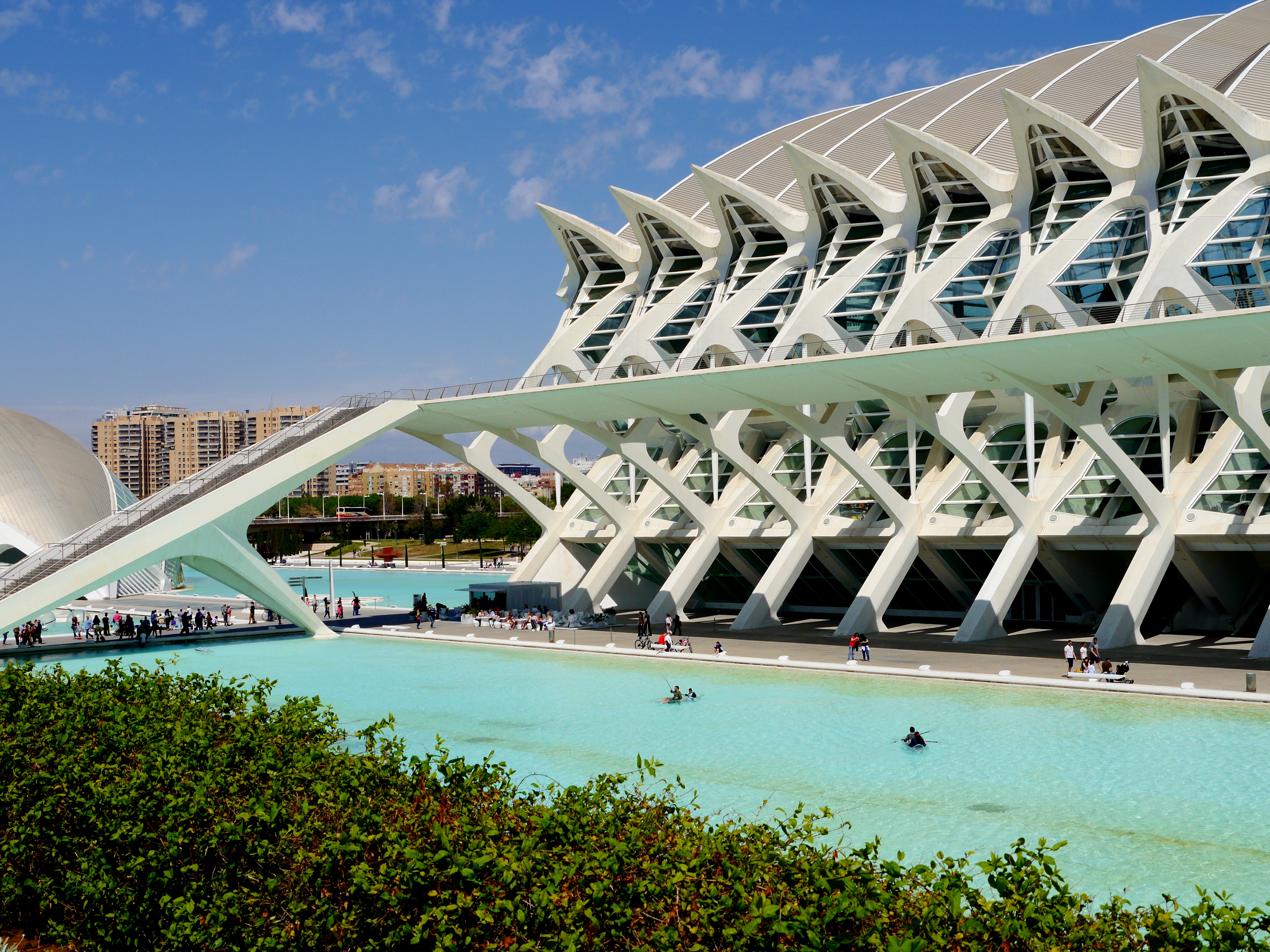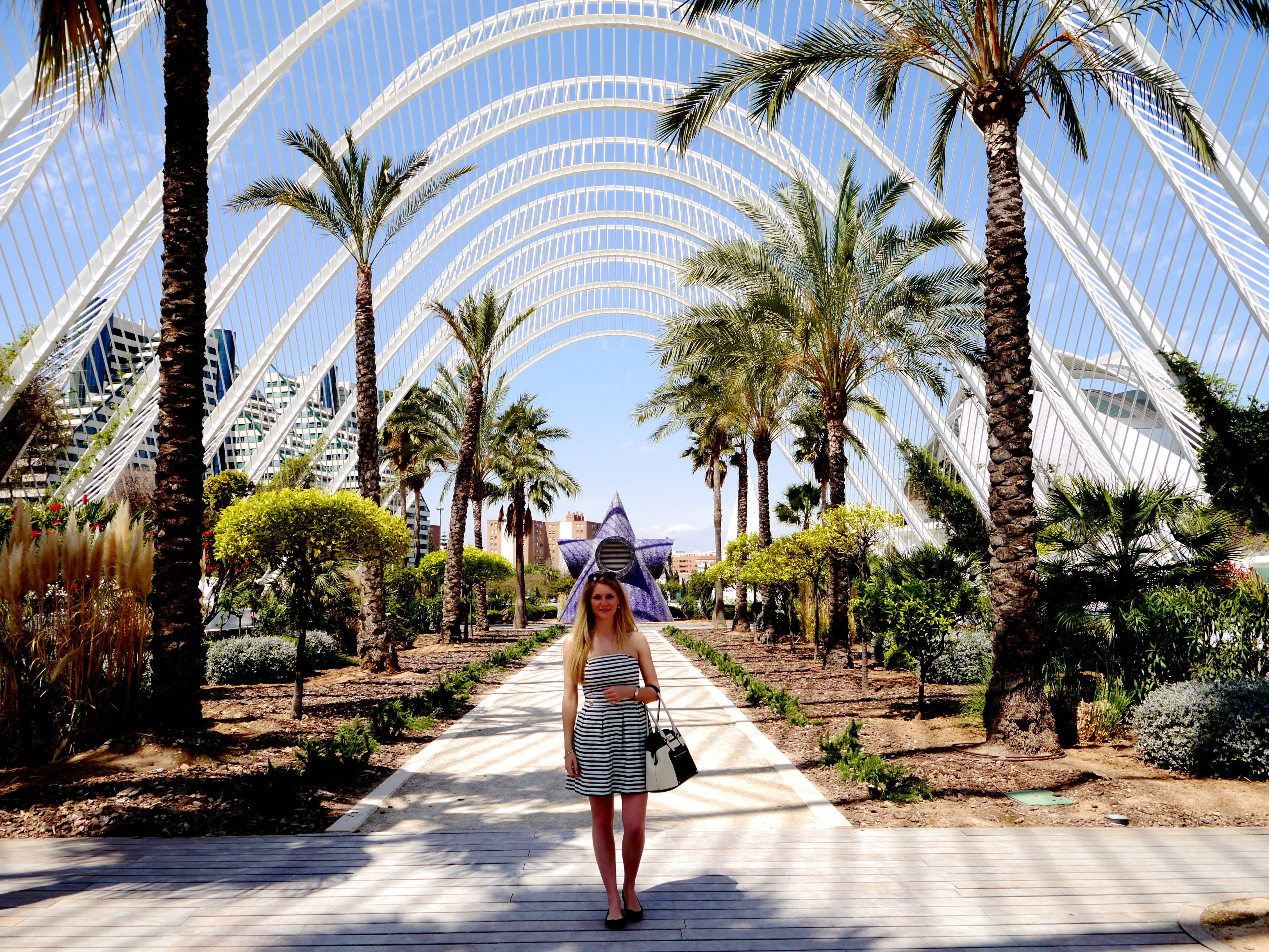 The next day (after a suitable lie-in to ward off any headaches) we saluted the sun by throwing on sundresses and sunglasses and heading to the famed City of Arts and Sciences – and what an unusual place it is! Quite the futuristic experiment by architect Santiago Calatrava, the whole project of 7 buildings took 11 years to complete (1994-2005) and cost the city over €1 billion, a whopping four times over the initial budget. It has the Palau de les Arts Reina Sofia (an opera house), Principe Felipe Science Museum, Hemisfèric (an IMAX Cinema, planetarium and laserium) and the Oceanogràfic (Europe’s largest aquarium) and a few other structures to admire such as the Umbracle (a landscaped sculpture walk) which I featured in my postcard on Monday.