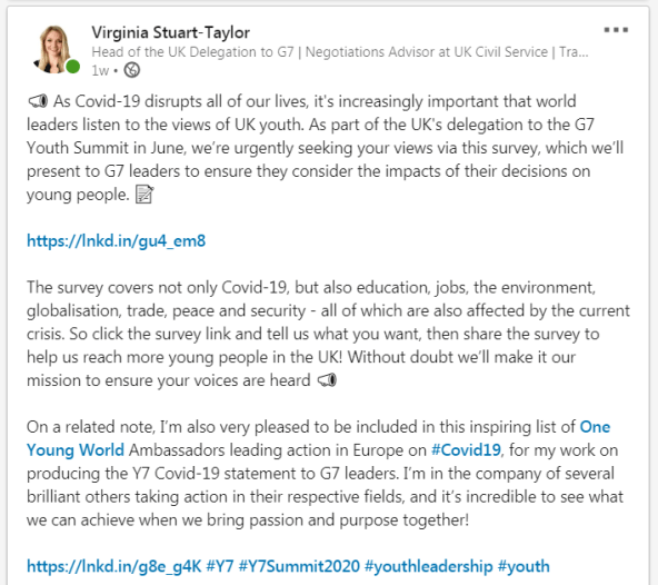 If you have access to a group or network of young people that you think would like to get involved in our consultations, please do share our survry above, comment below, message me on social media or email us at youth7UK@gmail.com! We’d love to include your opinions and policy ideas in our consultation. It can be a university society, a class, a sports club, an employee network, or an actual youth leadership network like One Young World – please do let us know! Please do also follow us on Instagram (@youth7uk) and Twitter (@youth7uk) to see how the preparations and the summit go.