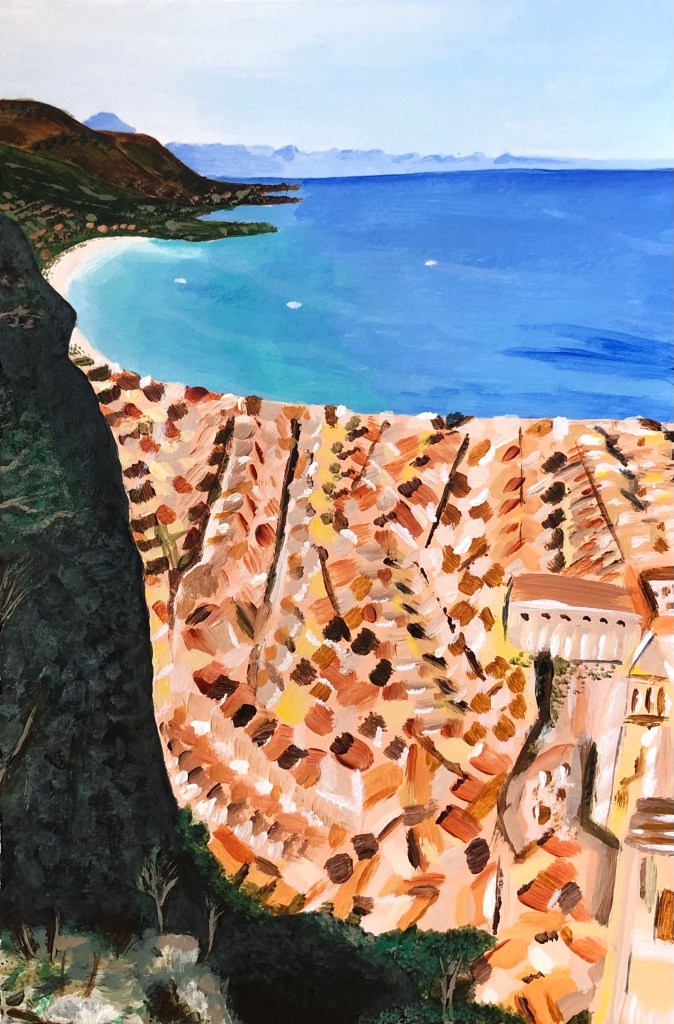 Today the series continues with a painting of Cefalù, a coastal city on the north coast of Sicily. This view is reached by climbing up La Rocca, a 268m-high cliff overlooking the city. ‘La Rocca’ was first an Arab citadel, followed in 1061 by a Norman castle whose ruins can still be seen atop the summit. Entrance costs €4 and the hike takes a good hour to reach the top, passing the ruined 4th-century BC ‘Temple of Diana’. It’s best done early in the morning to avoid the wrath of the midday Sicilian sun. From this vantage point, you look down over the terracotta roofs of Cefalù and the city’s Cathedral dating from 1240, the turquoise waters of the sea, and far along the coast from Palermo in the west to Capo d’Orlando in the east.